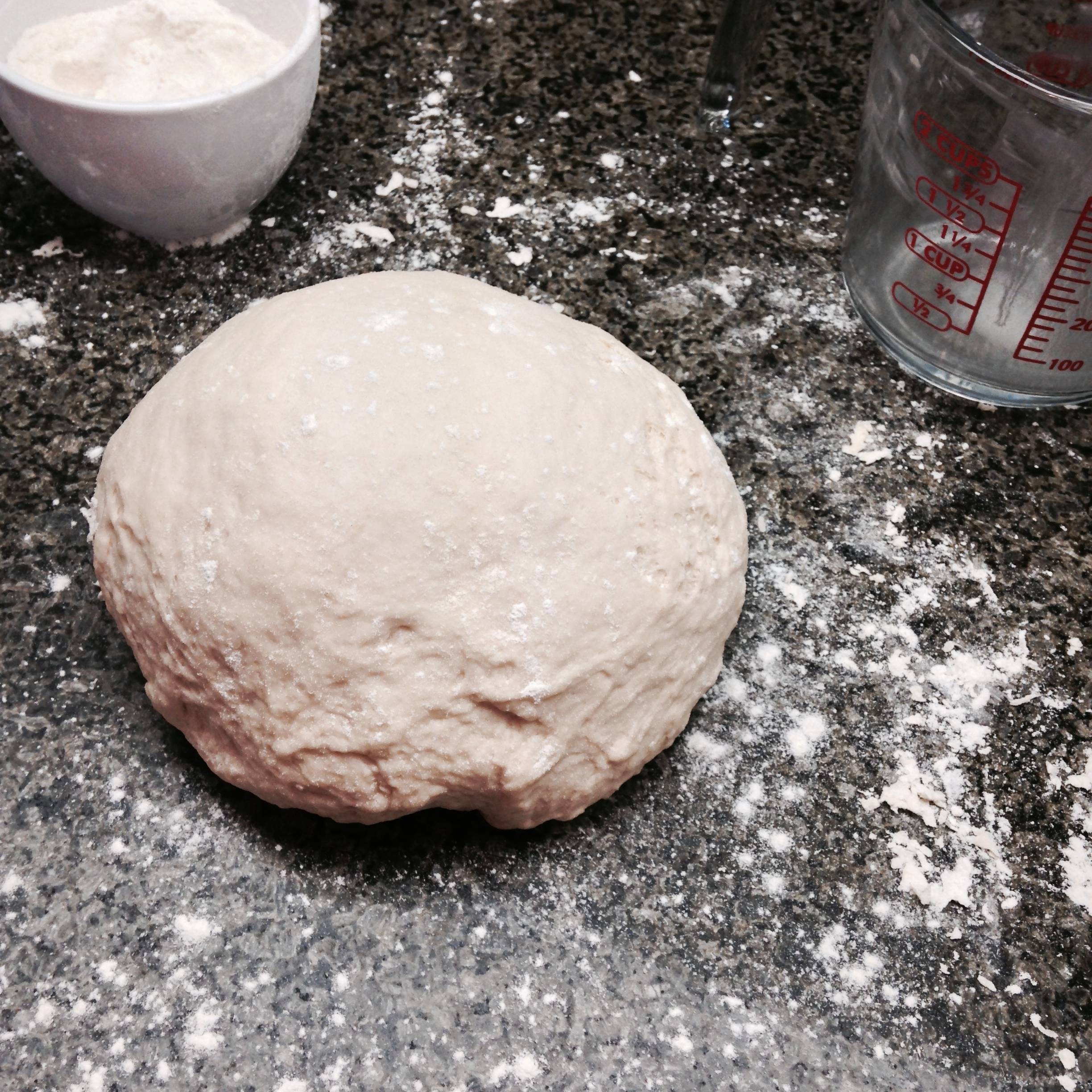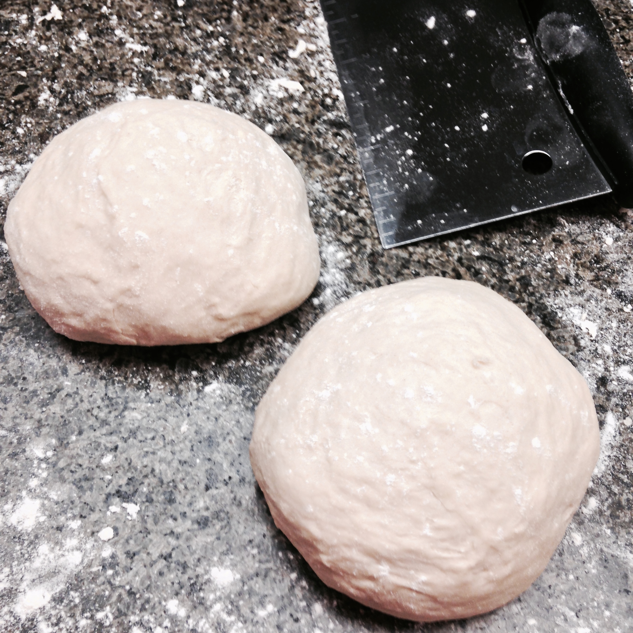 5. When you’re done kneading, form the dough into a ball. Cut into two even pieces. (cutting things evenly is my downfall, so don’t worry if it’s not perfect) Form each piece into a ball.