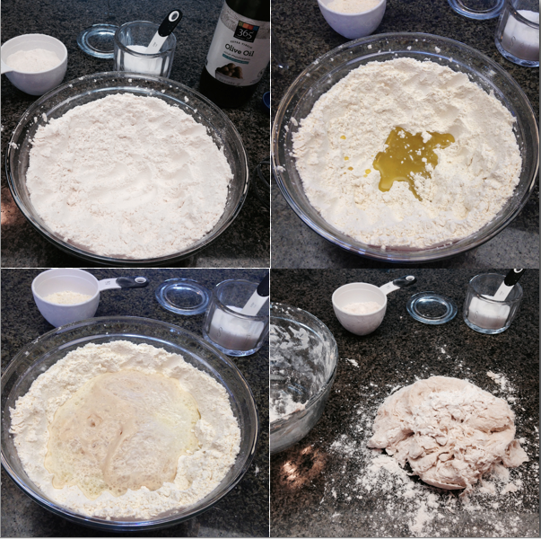 The next major step in the pizza dough making process is mixing everything together. At first, it will look like a flour-y mess, but don’t worry, it will come together in the end.