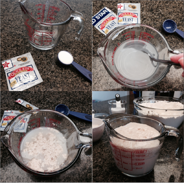 1. In a liquid measuring cup, add 1 1/3 cup of warm water. Add sugar and mix until it is dissolved. Then add yeast packet and gently mix. Leave this mixture until it has foamed almost to the top, about 10-15 minutes. *as pictured above