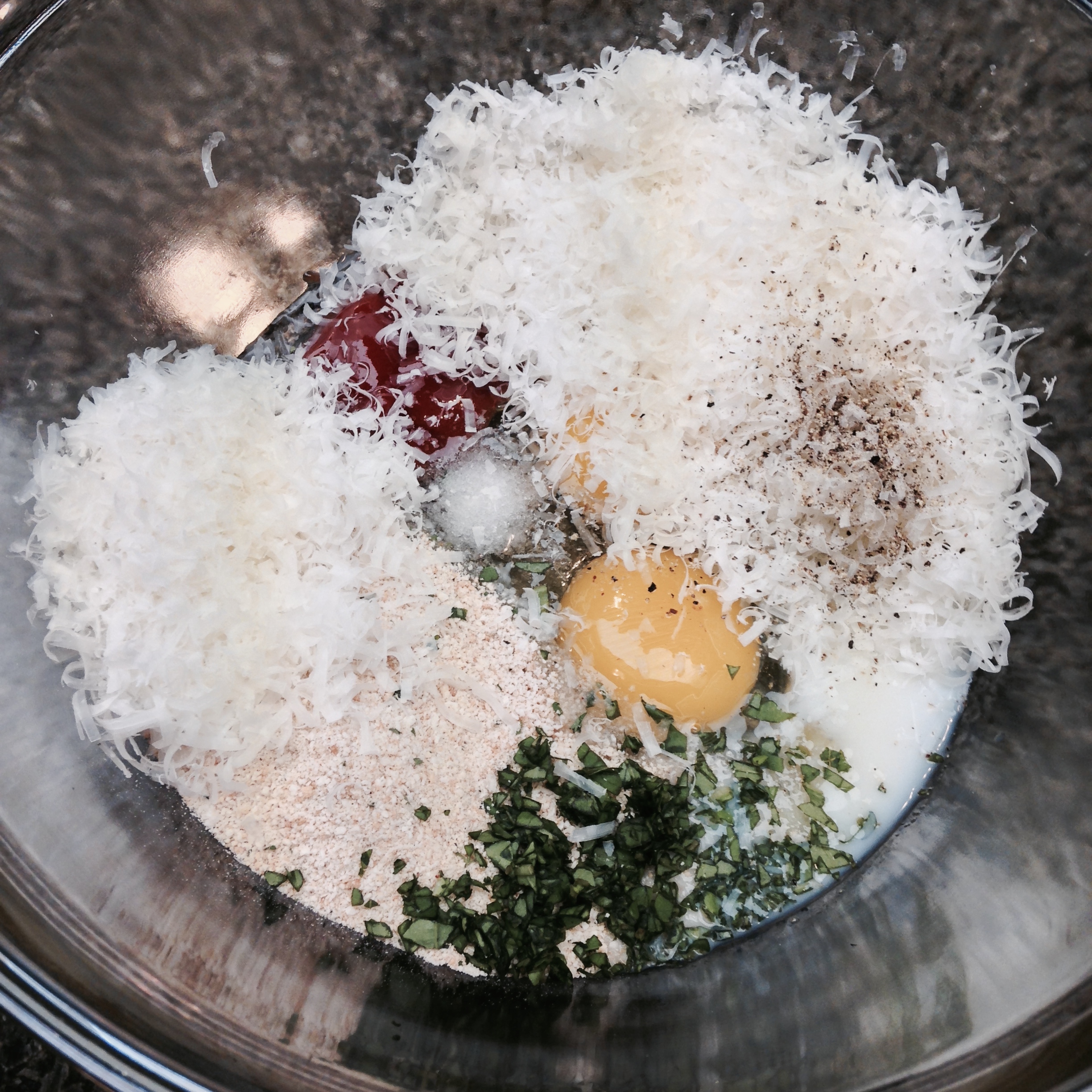 2. In a large bowl, add breadcrumbs, 1 -2 teaspoons basil, eggs, milk, ketchup, 3/4 cup Parmesan, salt, and pepper and whisk until combined. Add ground chicken and gently mix until well combined.