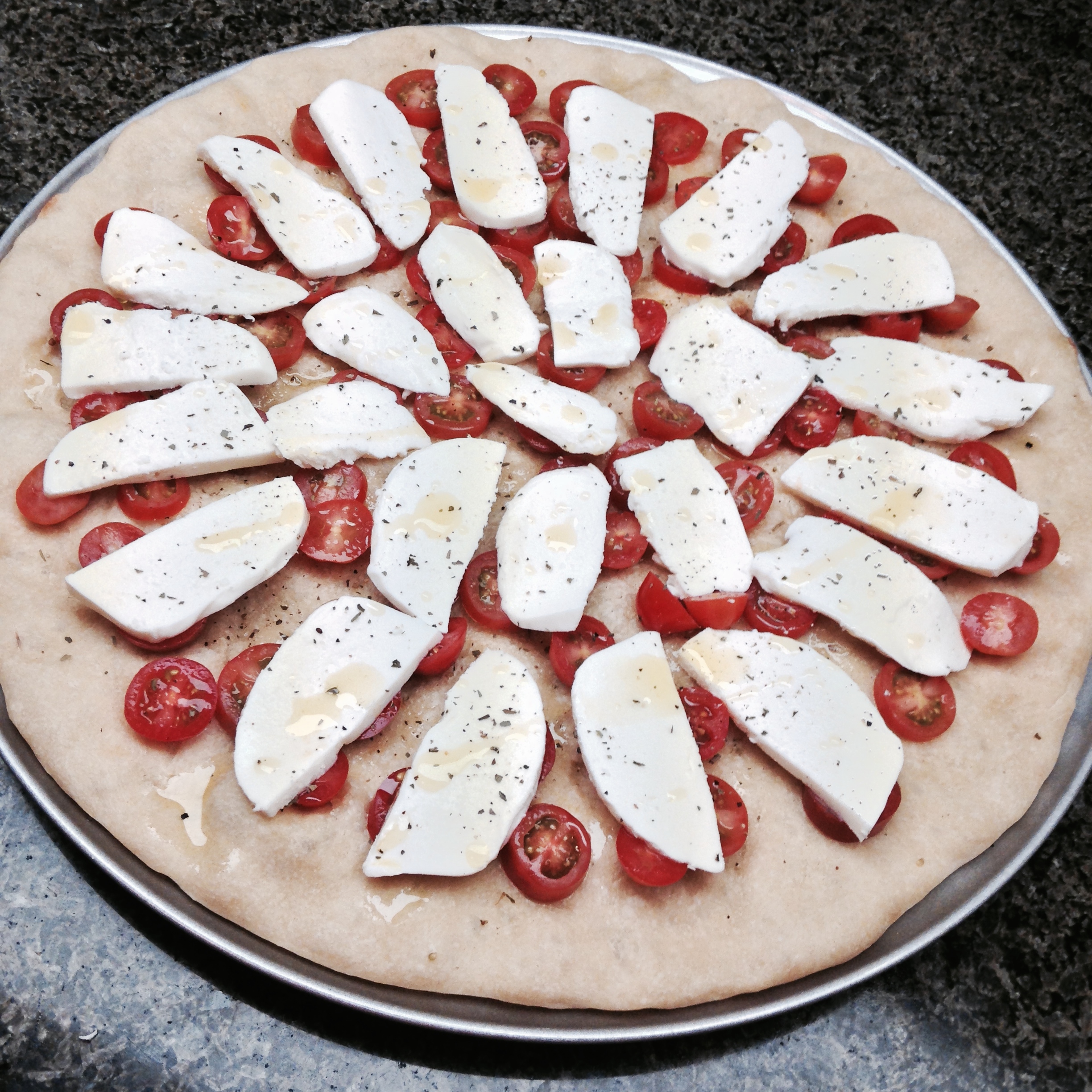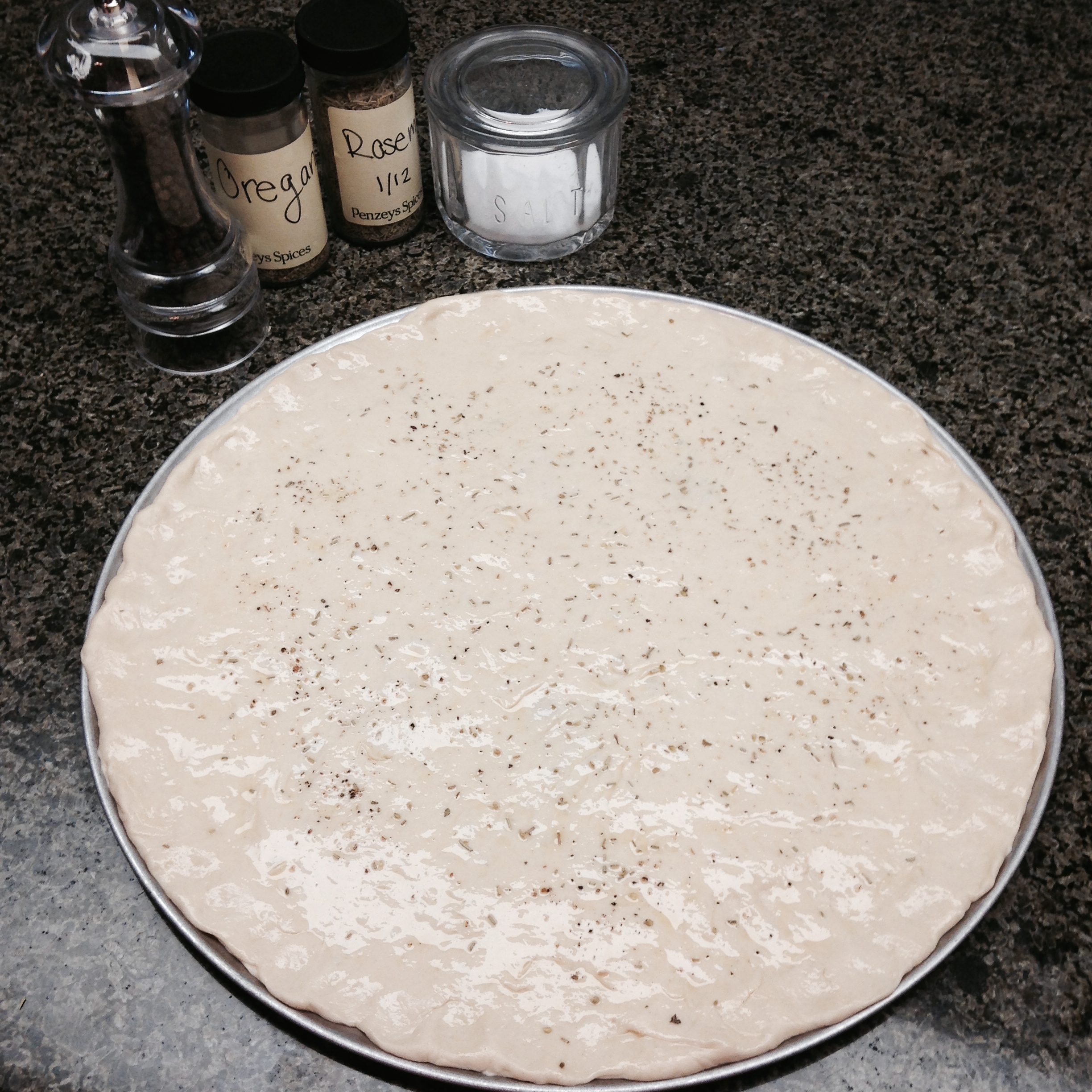 4. Drizzle a few teaspoons of olive oil on the dough and spread it around. Evenly, salt and pepper to taste and add a few sprinkles of oregano and rosemary. *pictured above* Bake for about 5 minutes and then remove from the oven.