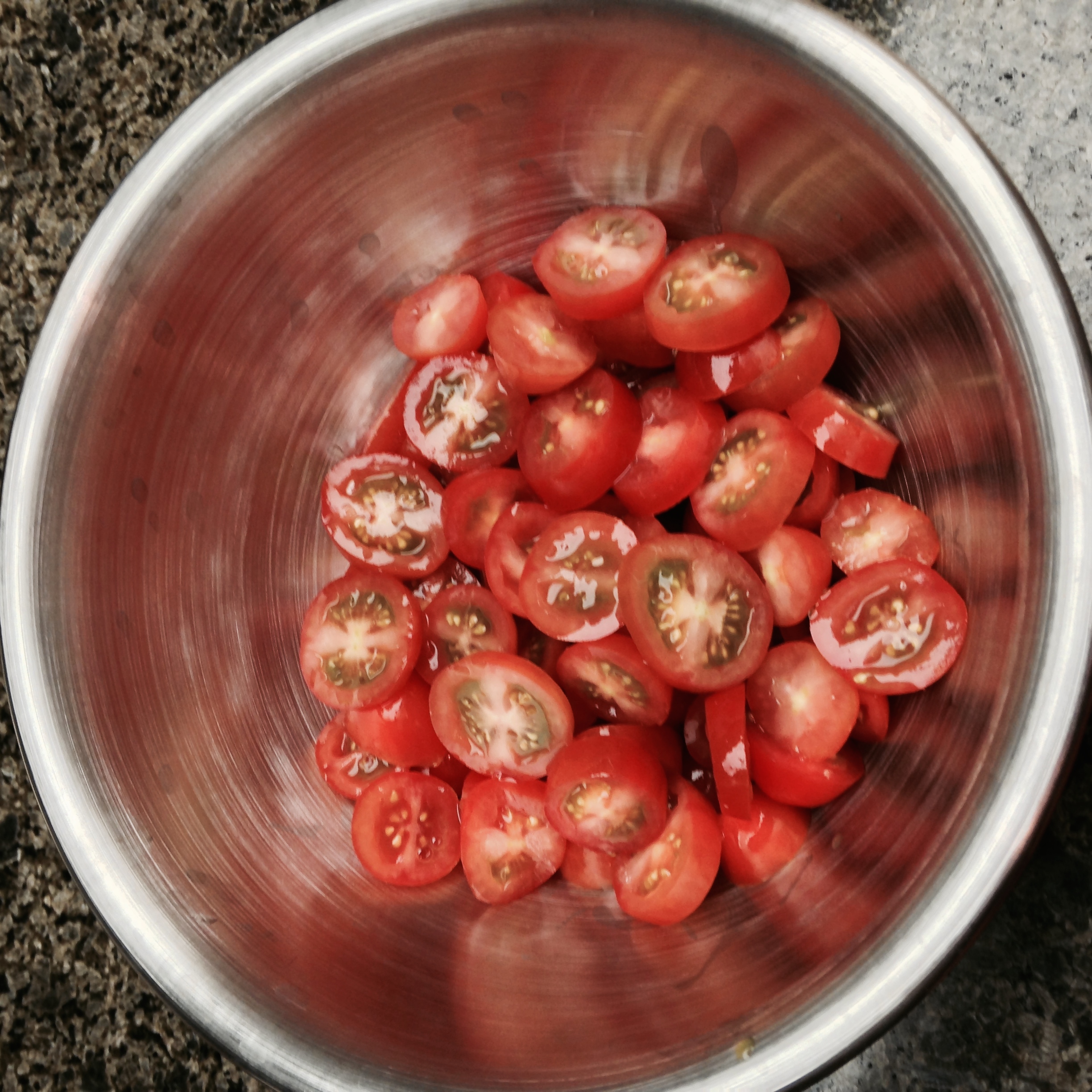 For slicing the tomatoes for this pizza, I use a very sharp paring knife to slice them in thin slices. (pictured above)