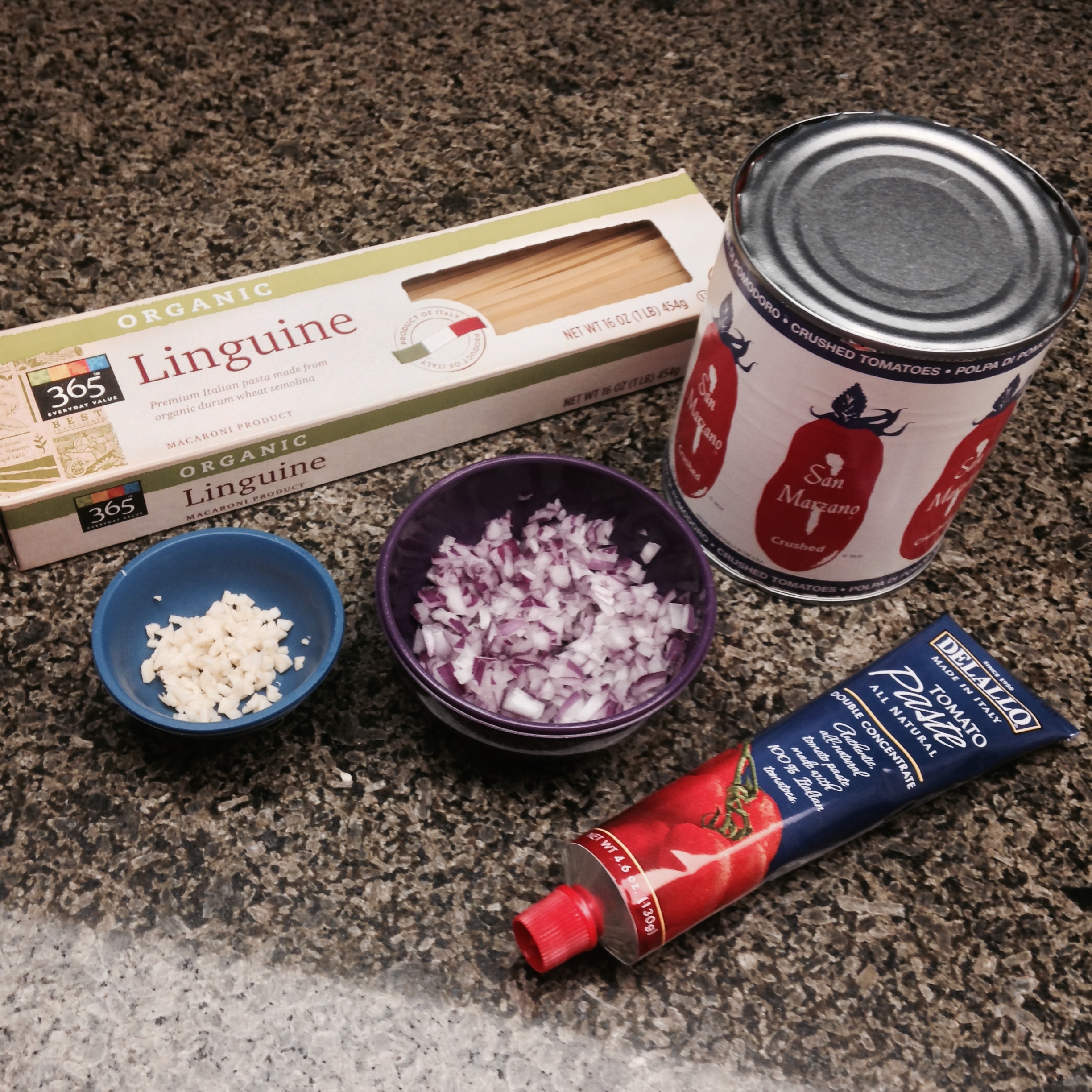 1. Start boiling water for the pasta. While waiting for the water to boil, prep your ingredients; chop the onion and mince the garlic.