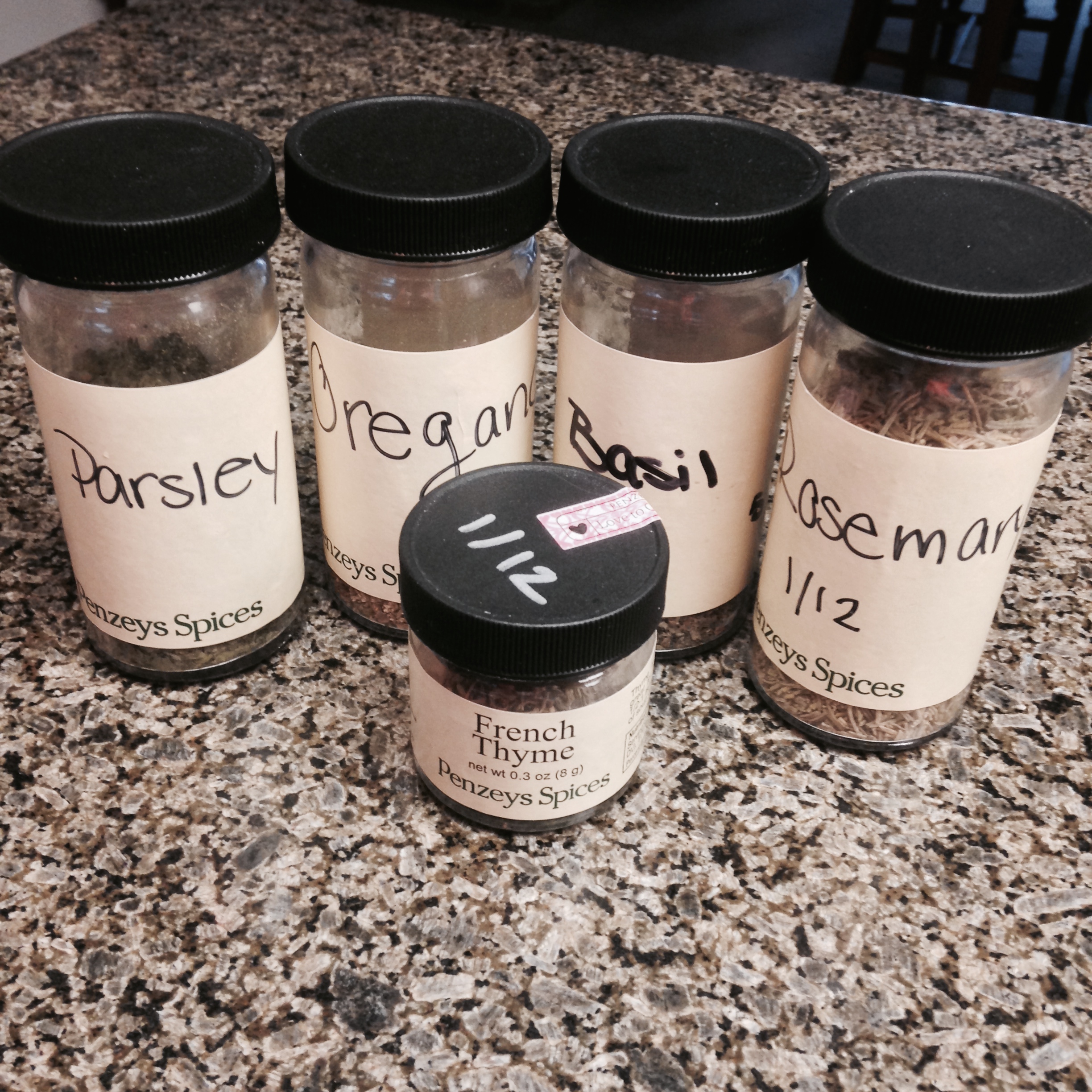I just wanted to show the herbs that I use for this recipe; parsley, oregano, basil, rosemary, and thyme. These ones are from Penzeys Spices.
