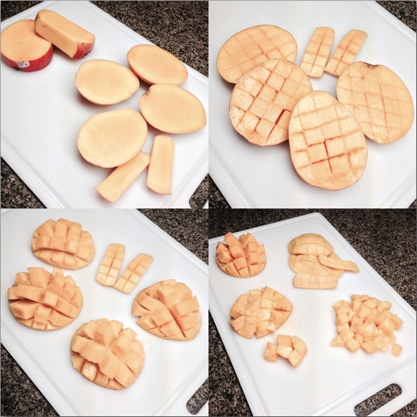 It’s a super easy process; just let the fruit ripen, cut it into small pieces, and freeze. I have pictured above the process I use to cut mangos. Then when you want a smoothie, you have all your favorite fruits on hand. My personal favorite smoothies are peach/blueberry/banana and mango/peach/banana.