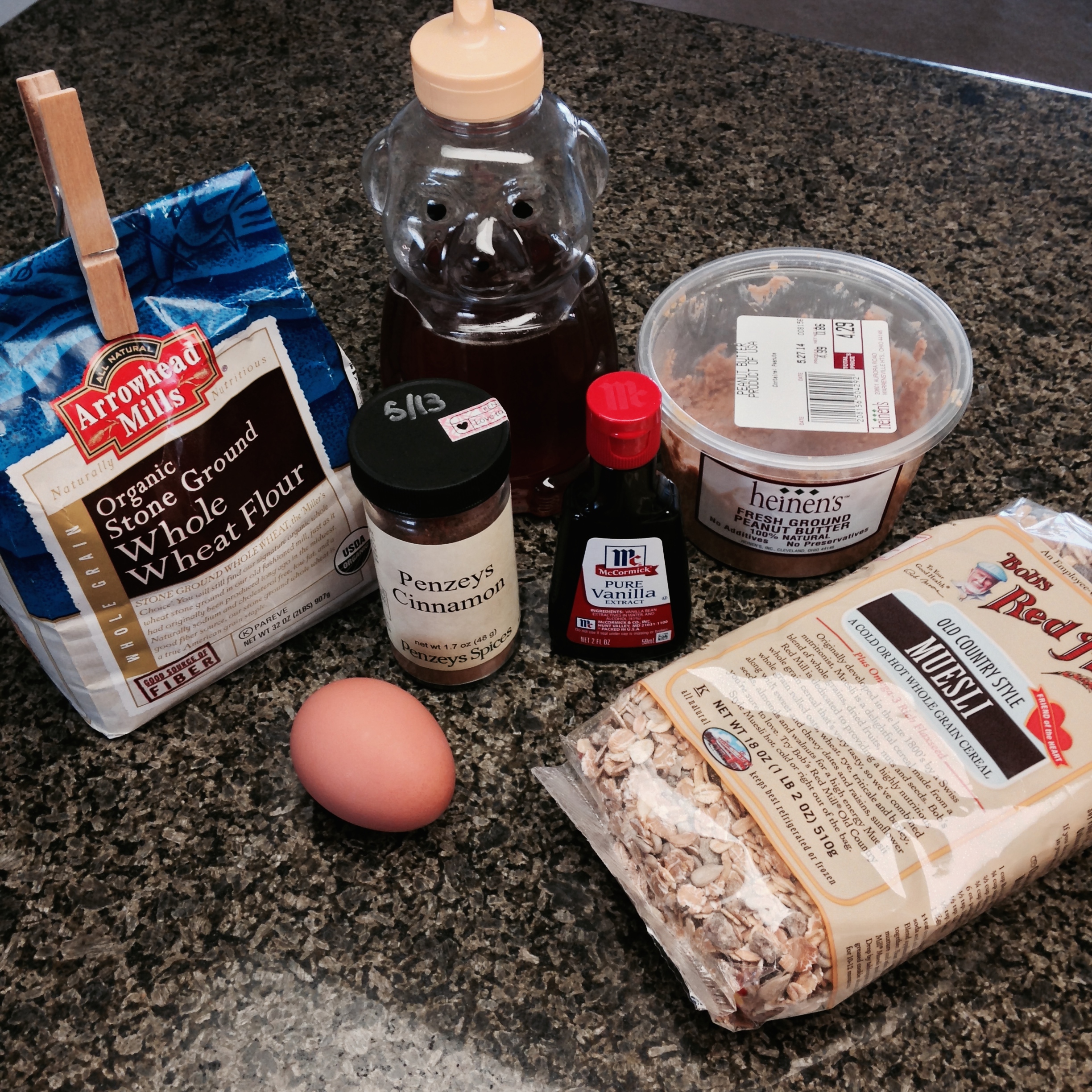 Pictured above are some of the ingredients I used. The original author added an excellent note about how to substitute muesli if you can’t get your hands on it, so I’ll add that in here: “If you don’t have any muesli on hand, replace with 1 cup of rolled oats plus 1/2 cup of dried fruit and 1/4 cup of chopped nuts and seeds.”