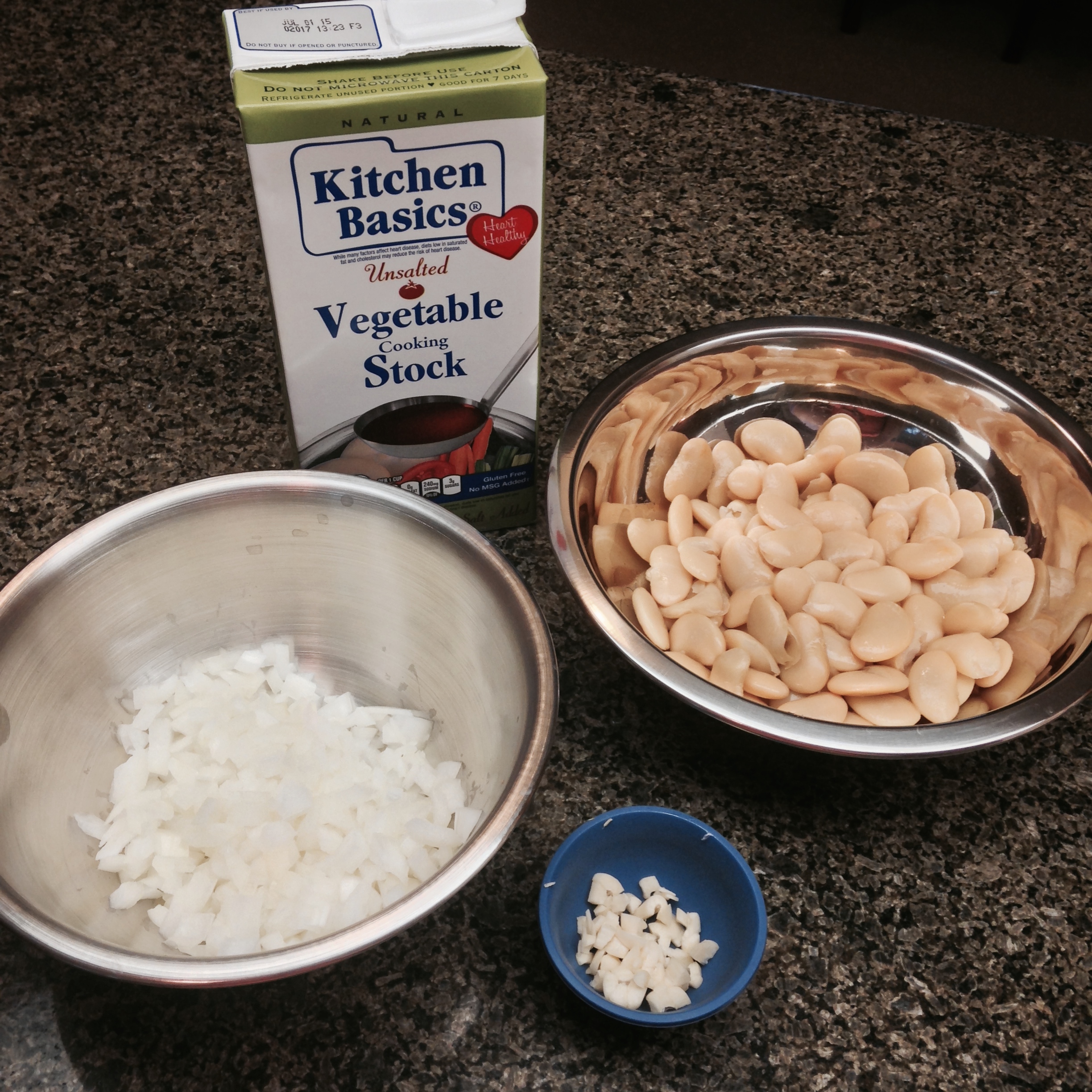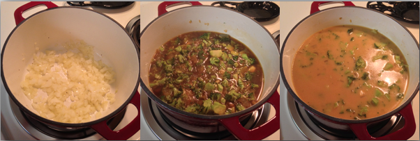 2. In a medium pot, heat up the olive oil. Sauté the onion until soft, about 5 minutes while covered, then add the garlic.