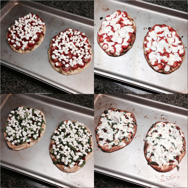 1. Pre-heat your oven to 400°F. Prep all ingredients and put naan bread on sheet pans.