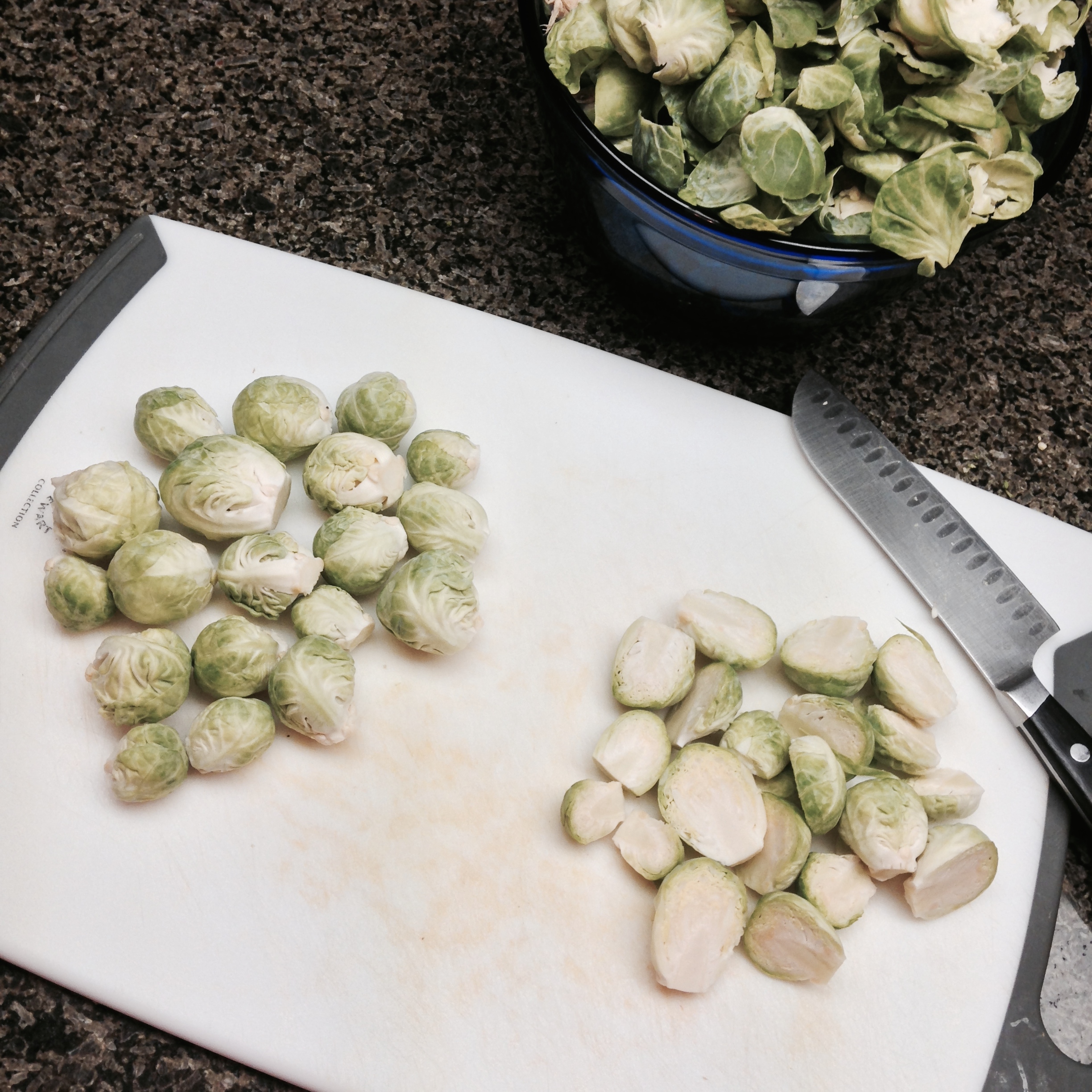Finally, right before you cook them, rinse them. And I have to stress the ‘right before’. The Brussels Sprouts will hold onto the water and you don’t want them to sit in the fridge filled with water. But the water does aid in the roasting process.
