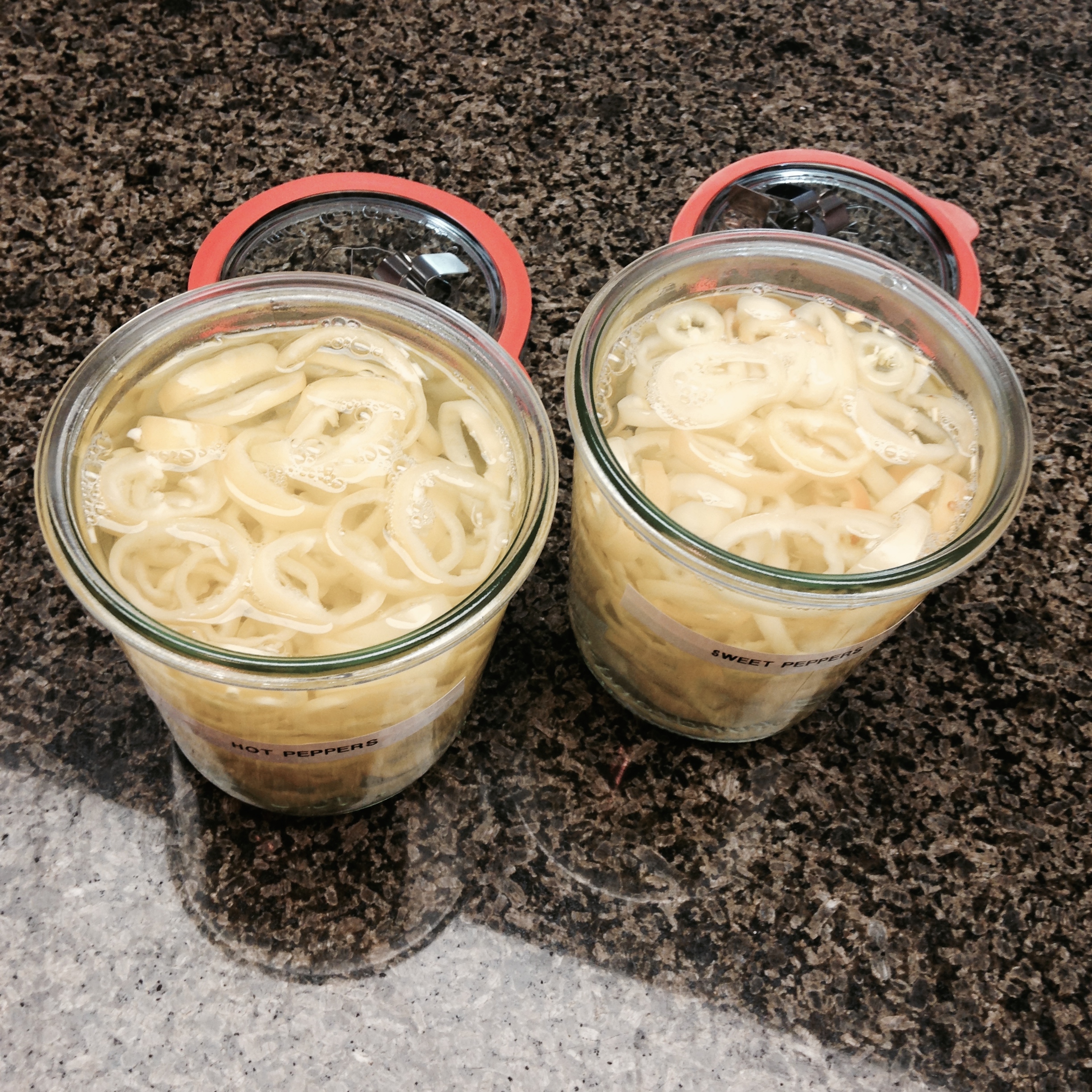 In our garden this summer we grew sweet banana peppers and hot banana peppers, so I made a separate jar for each. I just made sure to be extra careful when cutting them (I cut the sweet ones first) and when labeling the jars.