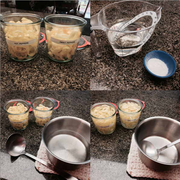 1. Prep peppers: clean, cut off both end, remove seeds, and slice into rings. Place peppers into jars. Measure out the other ingredients.